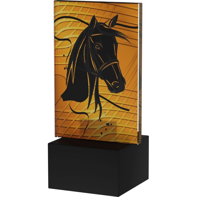 Statuetka - jeździectwo - koń, w wersji ekonomicznej, stworzona przy pomocy druku przestrzennego na szkle o grubości 6 mm. Wysokość wraz z kamienną podstawą to 12 cm. Opcjonalnie istnieje możliwość personalizacji nagrody dodając tabliczkę na podstawie.