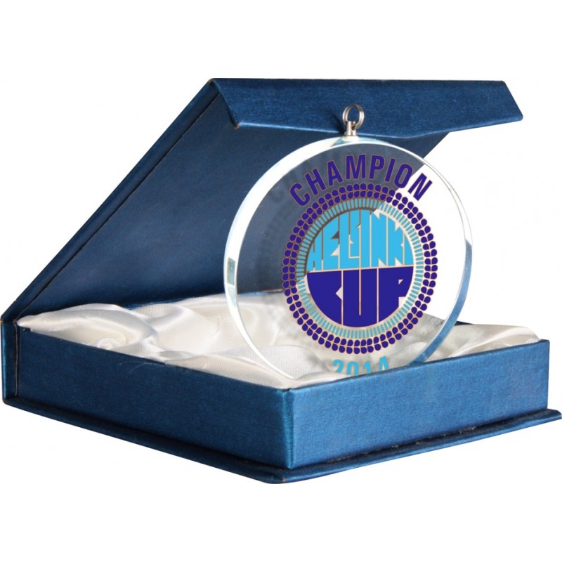 Ekskluzywny medal szklany w etui, średnica 70 mm, grubość szkła 10 mm. Istnieje możliwość grawerowania tradycyjnego oraz nadruku LuxorJet - zobacz OPIS. Na zdjęciach przedstawiona jest przykładowe grawerowanie. W celu ustalenia grafiki prosimy o kontakt telefoniczny lub mailowy.