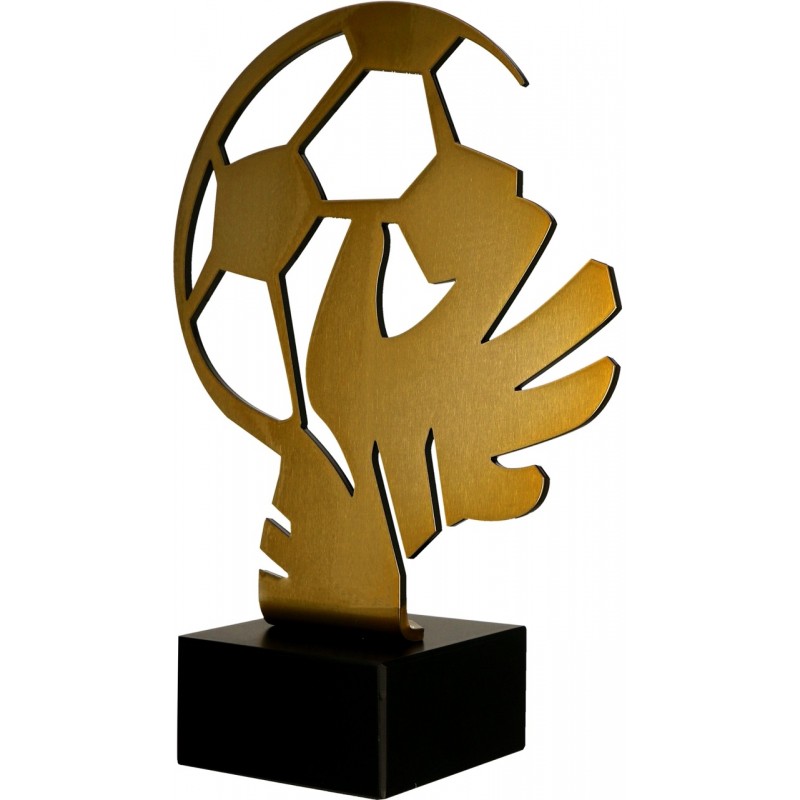 Statuetka piłka nożna - bramkarz, seria Metline heavy, wys. 30 cm. Wykonana z blachy metalowej w kolorze złota, pokrytej lśniącym lakierem, umieszczonej w ciężkiej, marmurowej podstawie. Grubość elementu metalowego - 5 mm, waga całości ponad 2 kg. Istnieje możliwość personalizacji na opcjonalnej tabliczce mocowanej do podstawy.