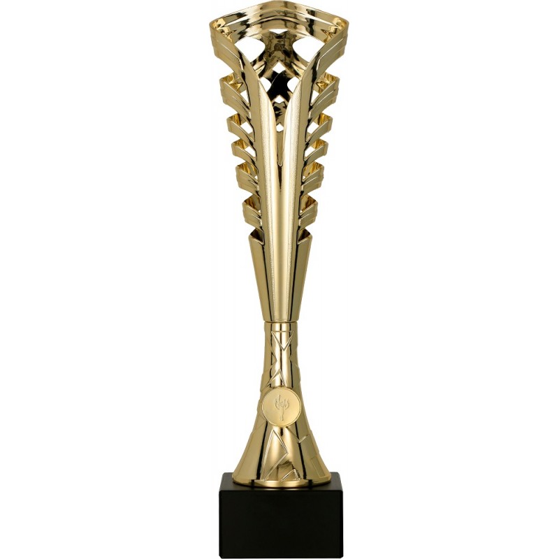Ekonomiczny, złoty puchar o ciekawym kształcie, dostępny w trzech wysokościach. Plastik, marmur. Miejsce na emblemat o średnicy 25 mm. Możliwość domówienia tabliczki z napisem.