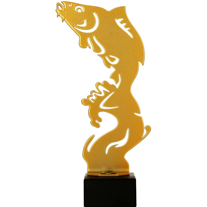 Statuetka wędkarska - ryba, karp, wys. 21 cm. Wykonana z blachy metalowej w kolorze złota o grubości 2 mm, przymocowanej do marmurowej podstawy. Istnieje możliwość domówienia tabliczki z napisem.