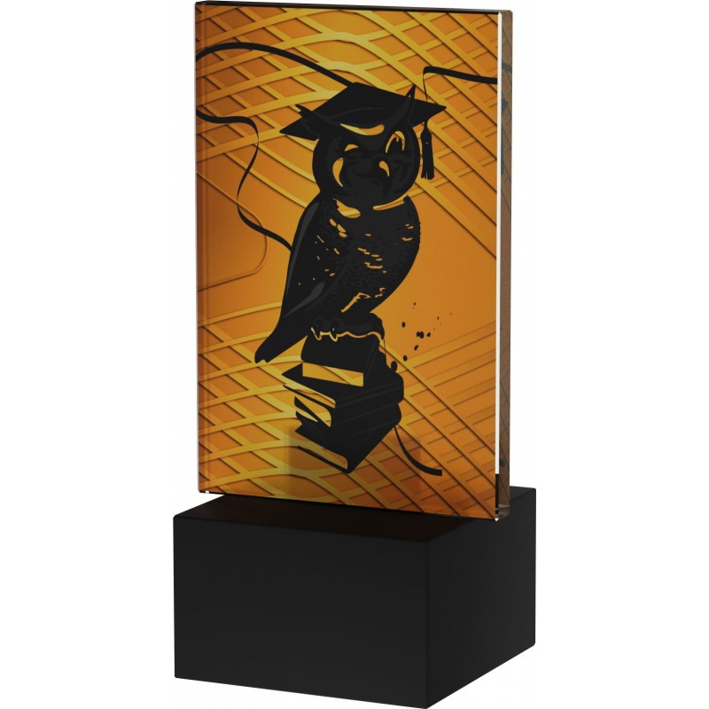 Statuetka szkolna - sowa na książkach, w wersji ekonomicznej, stworzona przy pomocy druku przestrzennego na szkle o grubości 6 mm. Wysokość wraz z kamienną podstawą to 12 cm. Opcjonalnie istnieje możliwość personalizacji nagrody dodając tabliczkę na podstawie.