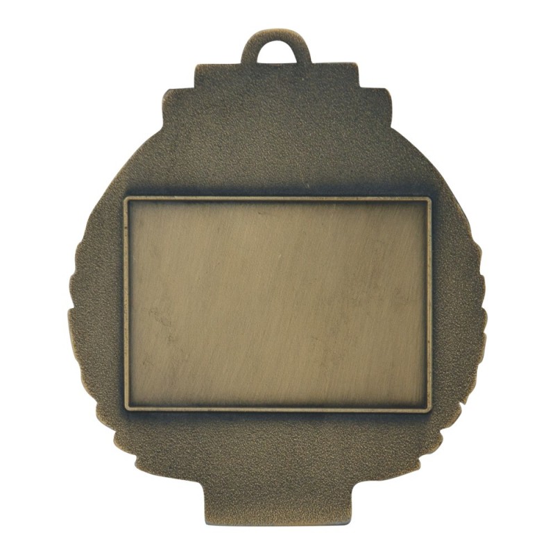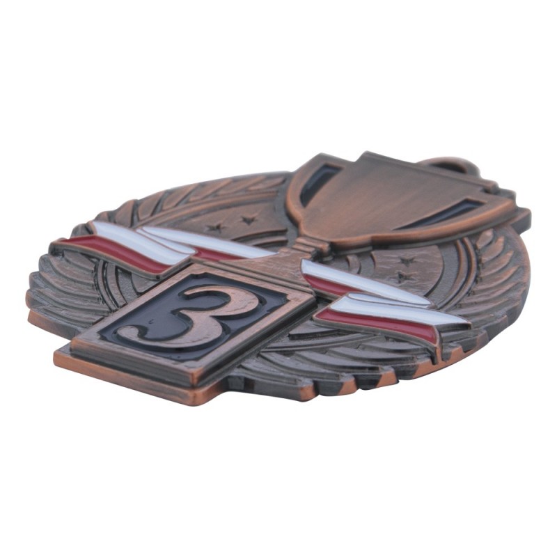 Gruby, patynowany medal przestrzenny - puchar, wymiary 75x64 mm, grubość 4 mm, wybrane elementy emaliowane, "oczko" do mocowania wstążki. Możliwość znakowania na rewersie.