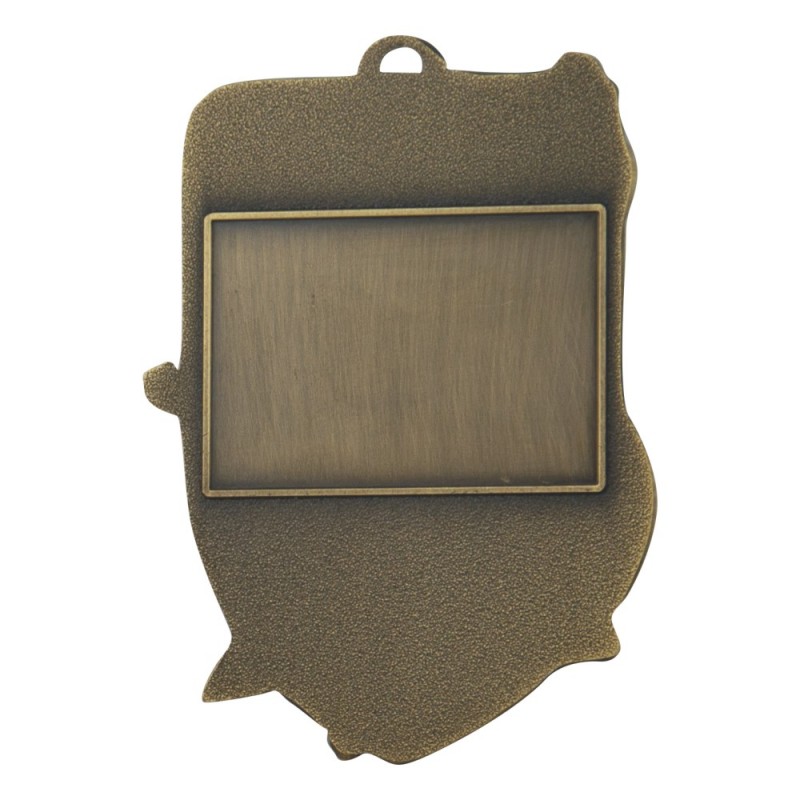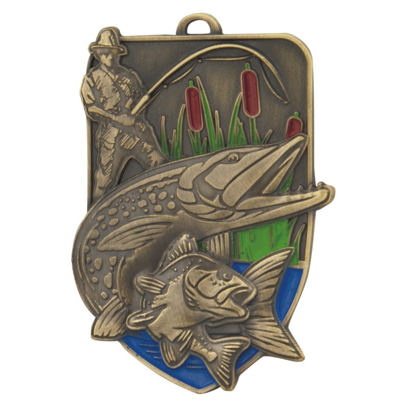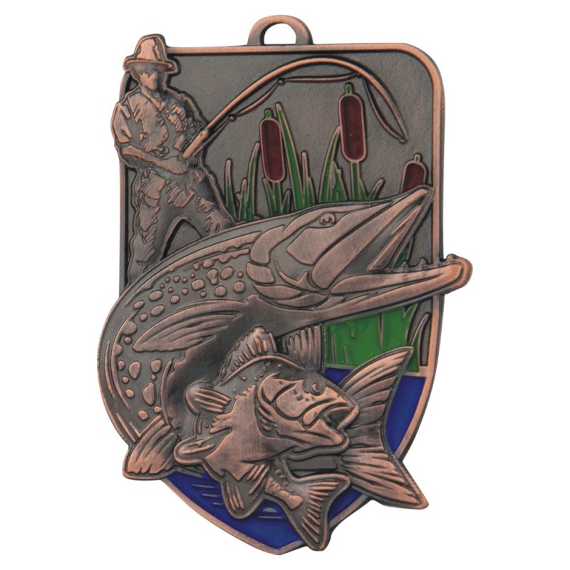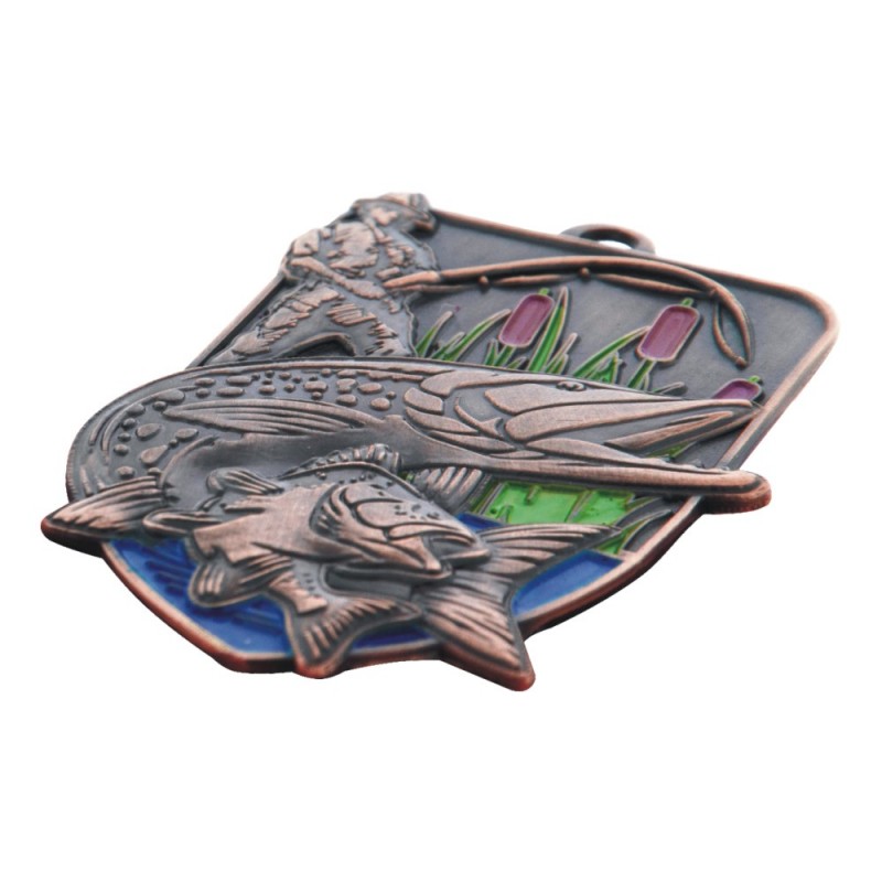 Gruby, patynowany medal przestrzenny - wędkarstwo, wymiary 85x59 mm, grubość 4 mm, wybrane elementy emaliowane, "oczko" do mocowania wstążki. Możliwość znakowania na rewersie.