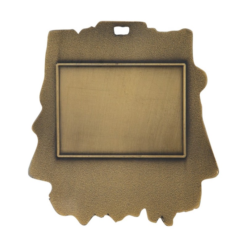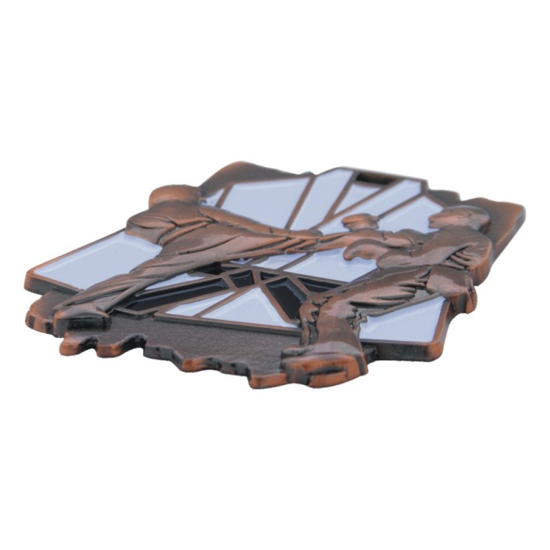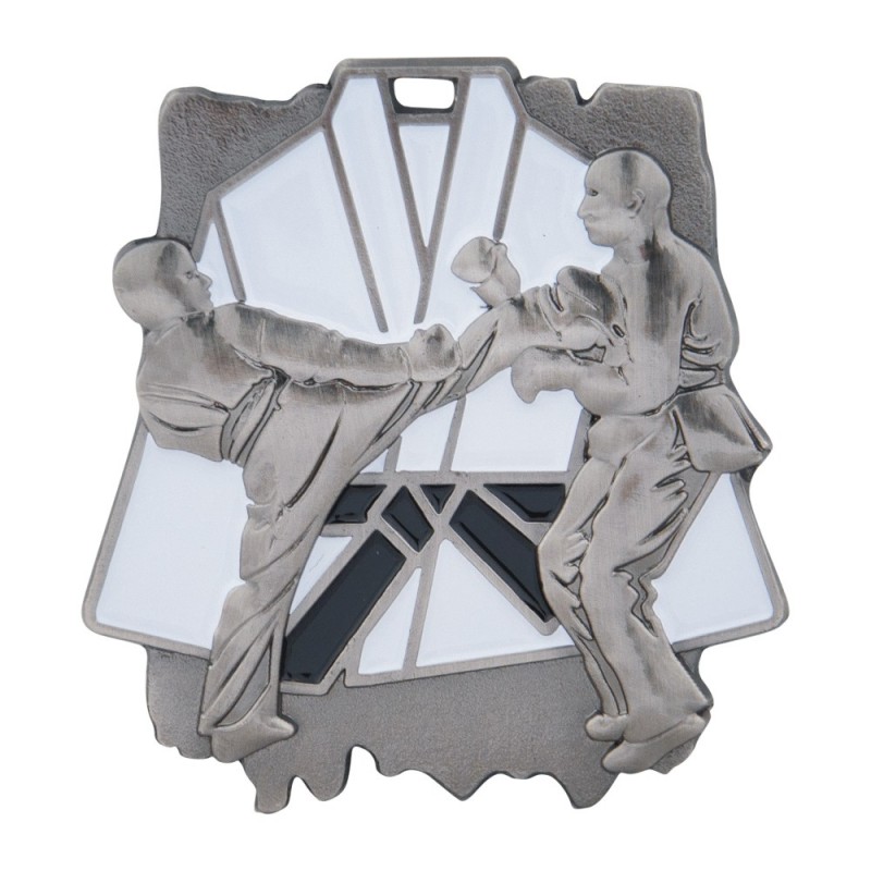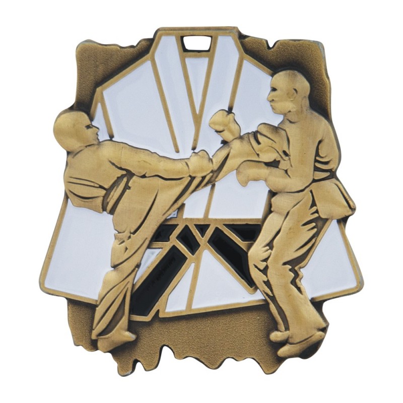 Gruby, patynowany medal przestrzenny - sporty walki, wymiary 71x66 mm, grubość 4 mm, wybrane elementy emaliowane, "oczko" do mocowania wstążki. Możliwość znakowania na rewersie.