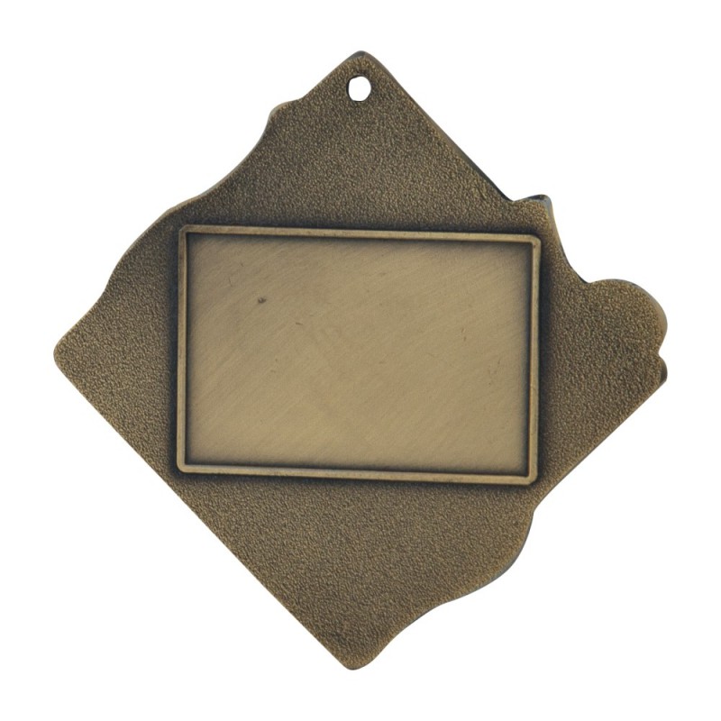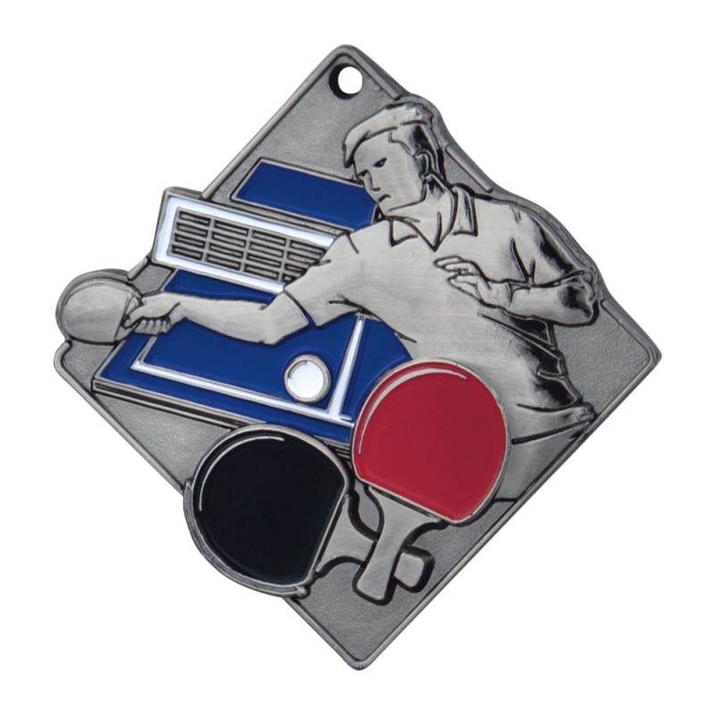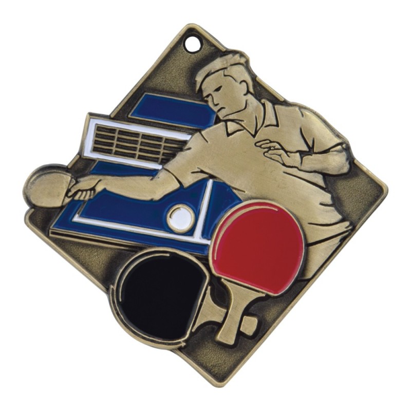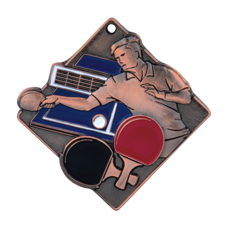 Gruby, patynowany medal przestrzenny - tenis stołowy, wymiary 70x70 mm, grubość 4 mm, wybrane elementy emaliowane, "oczko" do mocowania wstążki. Możliwość znakowania na rewersie.