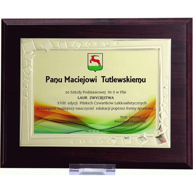 Dyplom z kolorowym nadrukiem na ozdobnej blaszce umieszczonej na podkładzie MDF, dostępny w różnych rozmiarach. Grafika przedstawiona na zdjęciu jest przykładowa. W celu ustalenia grafiki prosimy o kontakt telefoniczny lub mailowy.