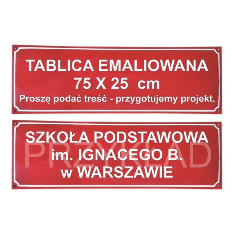 Urzędowy szyld emaliowany, wypukły, na zewnątrz budynku - wymiar 75 x25 cm, zgodny z rozporządzeniem dot. tablic i pieczęci urzędowych dla większości jednostek organizacyjnych (stosunek boków 3:1, wysokość liter 5 cm). Przy zamówieniu proszę wpisać treść tablicy, nasz dział graficzny przygotuje i prześle do akceptacji wizualizację. TERMIN REALIZACJI OK. 14 DNI.