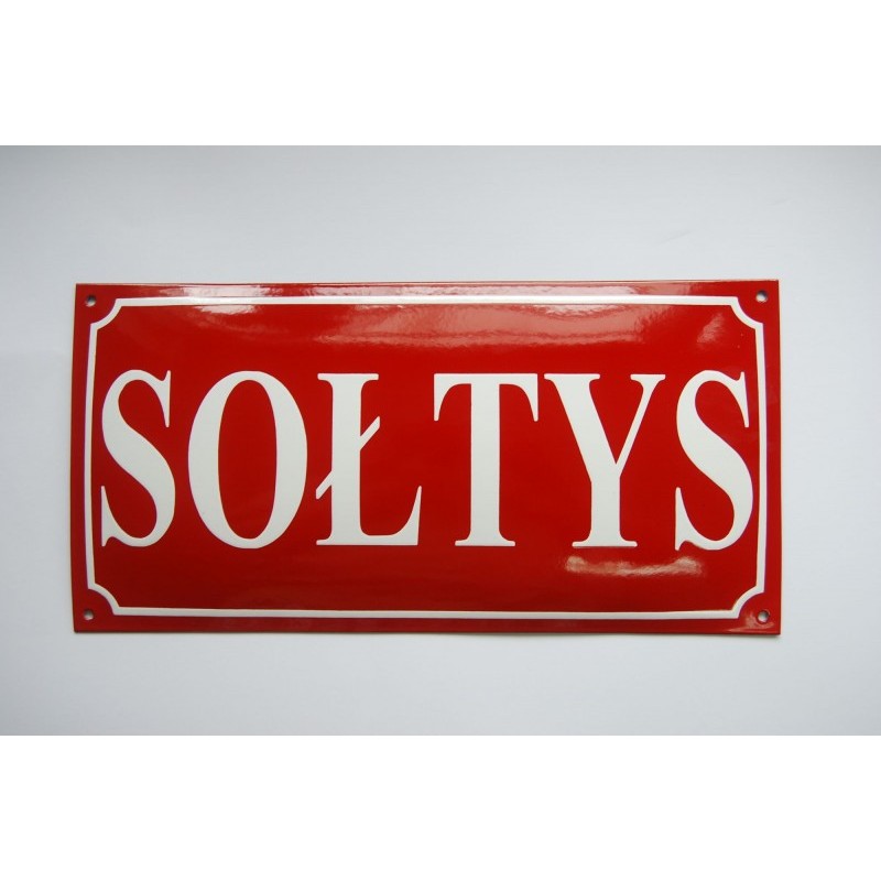 Urzędowy szyld emaliowany, wypukły, na zewnątrz budynku z napisem SOŁTYS. Szyld wykonywany z grubej blachy stalowej. Podczas procesu produkcji nakładanych jest kilka kolejnych warstw farb emalierskich. Całość wypalana jest w piecu emalierskim w temperaturze ok. 800 stopni Celsjusza. Proces ten gwarantuje 10 letnią odporność na warunki atmosferyczne. TERMIN REALIZACJI OK. 14 DNI.