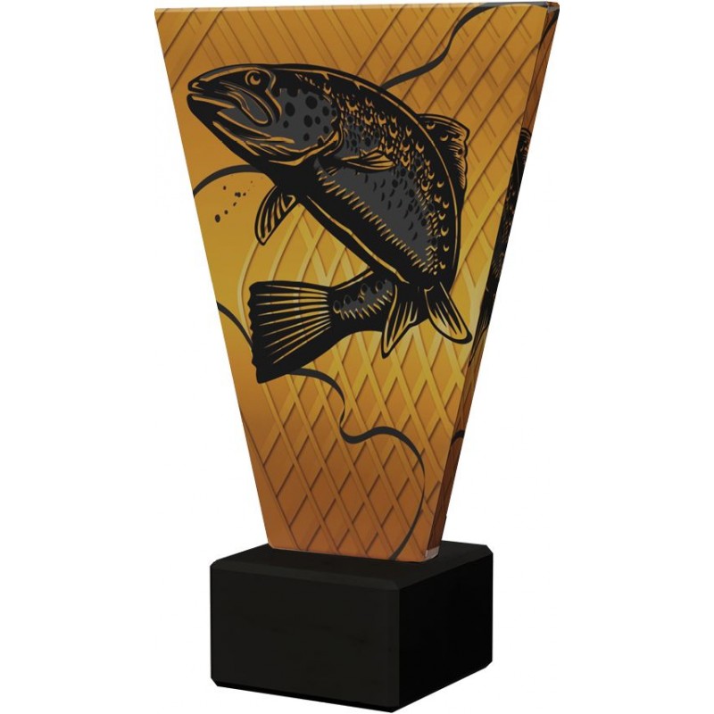 Statuetka wędkarstwo - pstrąg, występuje w czterech wysokościach. Grubość szkła 10 mm. Nowoczesny design oraz forma przestrzenna statuetki sprawiają, że trofeum to wyróżnia się spośród innych znajdujących się na rynku. Możliwość personalizacji nagrody poprzez umieszczenie wygrawerowanej tabliczki. TERMIN REALIZACJI DO 7 DNI ROBOCZYCH.